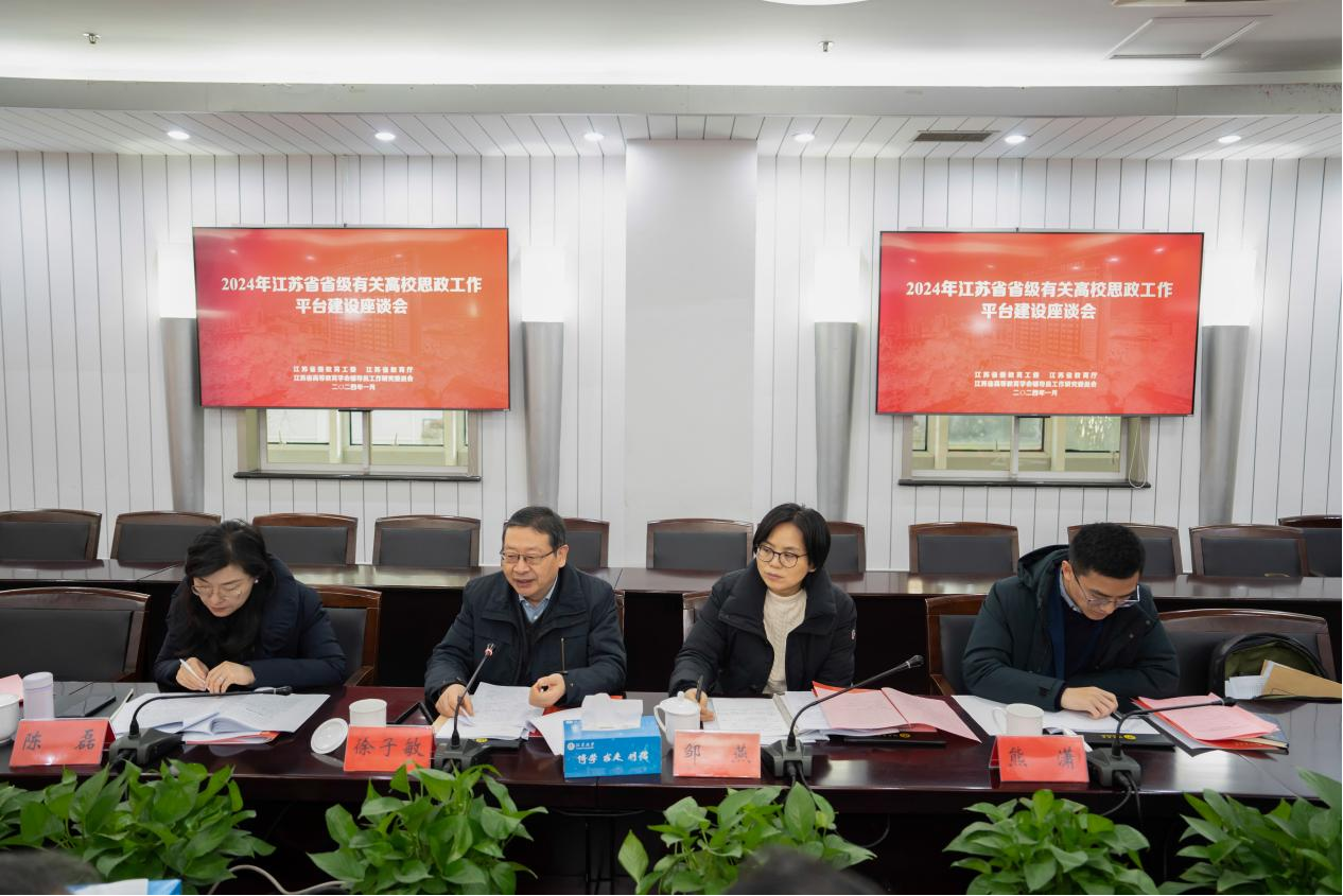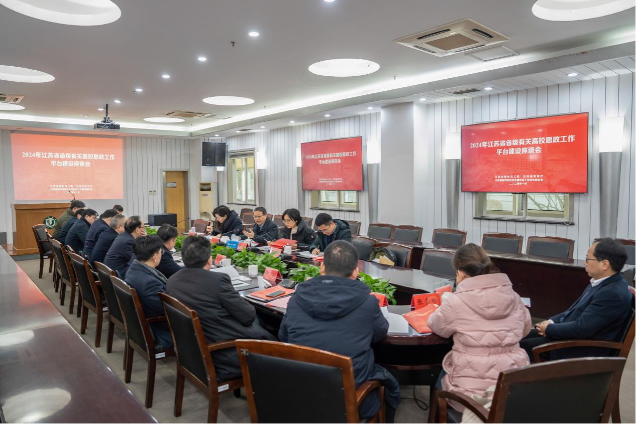 1月25日,2024年江蘇省省級有關高校思想政治工作平臺建設座談會在我校舉行。省教育廳一級巡視員徐子敏,南京工業大學黨委常委、副校長劉大衛,蘇州大學黨委常委、副校長查佐明,南通大學黨委常委、副校長吉明明,江蘇大學黨委常委、副校長任旭東,南京師范大學黨委常委、宣傳部部長宋喆,省教育廳社政處處長鄒燕、一級主任科員陳磊、掛職干部熊瀟,以及省網絡思政中心(易班中心)、8個省級高校輔導員培訓與研修基地負責人參加座談會。