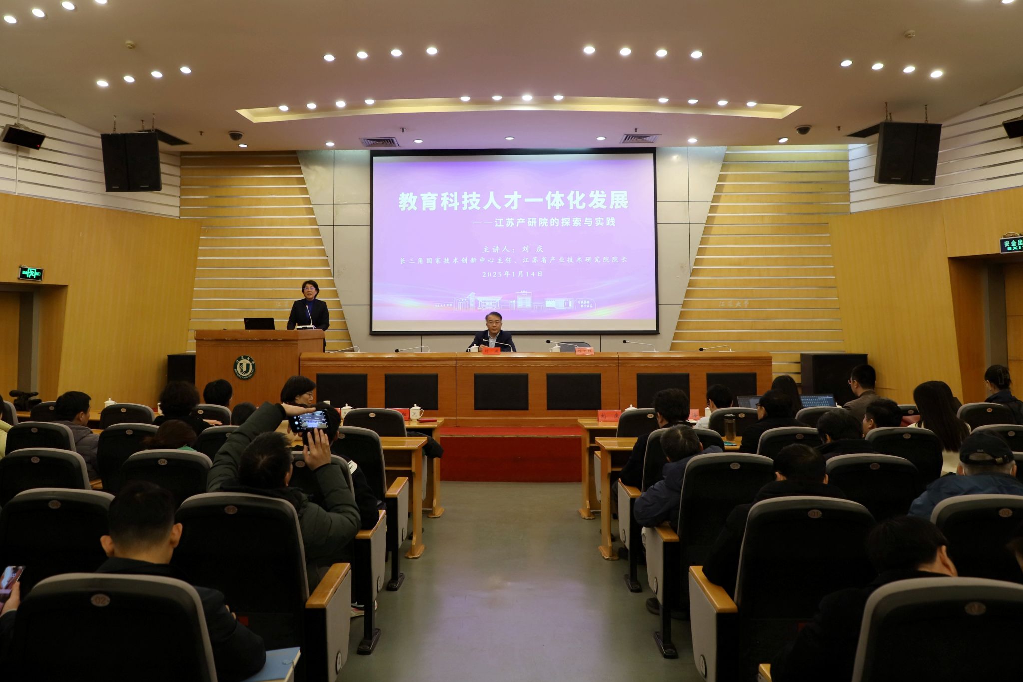 1月14日,長三角國家技術創新中心主任、江蘇省產業技術研究院院長劉慶教授應邀為我校師生作題為《教育科技人才“三位一體”促進高質量發展——長三角國創中心的探索與實踐》的報告。報告會由校長邢衛紅主持。副校長李紅、王景全,部分職能部門科級以上領導干部,學院師生代表參加報告會。報告會前,校黨委書記李洪波陪同劉慶一行參觀了校史館,深入了解學校的發展歷程及近年來取得的成就。
