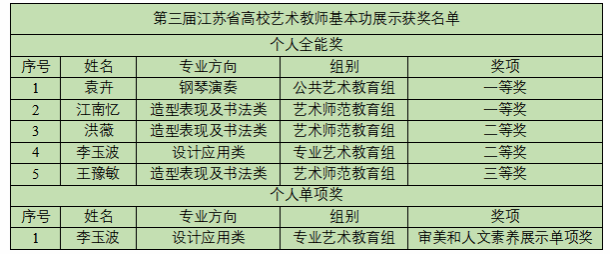 近日,由江蘇省教育廳主辦的第三屆江蘇省高校藝術教師基本功展示評審結果揭曉。我校共有5位教師獲獎,其中個人全能一等獎2項、二等獎2項、三等獎1項,審美和人文素養(yǎng)展示單項獎1項。