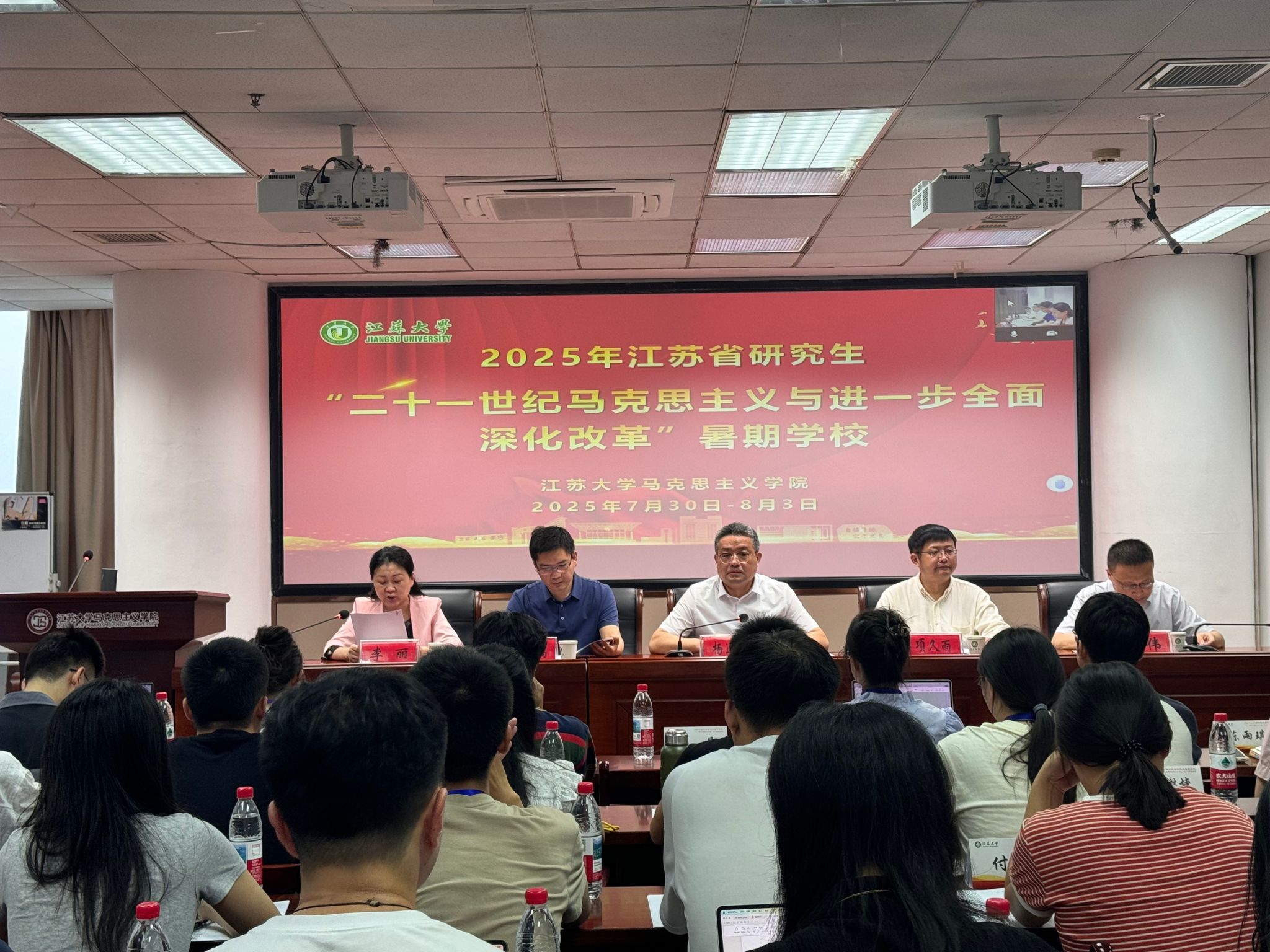 7月31日,江蘇省研究生“二十一世紀馬克思主義與進一步全面深化改革”暑期學校在我校開班。江蘇省哲法史學類研究生教育指導委員會主任委員、南京郵電大學校長、博士生導師葉美蘭,江蘇大學黨委常委、副校長楊道建,武漢大學主流意識形態研究院院長、弘毅特聘教授、博士生導師項久雨,江蘇省哲法史學類研究生教育指導委員會秘書長、南京郵電大學馬克思主義學院副院長朱奎澤,江蘇大學馬克思主義學院黨委書記徐偉、研究生院副院長周正嵩、馬克思主義學院副院長肖建國等出席開班儀式。儀式由江蘇大學馬克思主義學院院長李麗主持。
