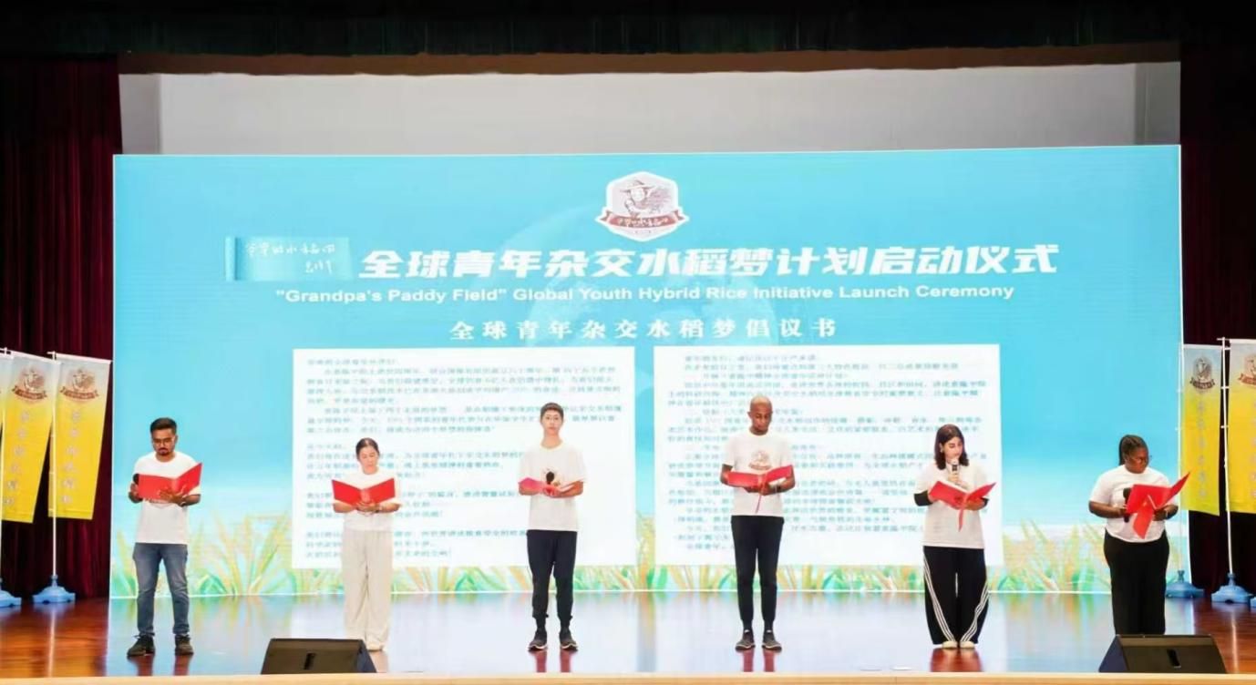 儀式上,中外青年學生代表上臺宣讀《全球青年雜交水稻夢倡議書》。倡議書指出,在袁隆平院士逝世四周年、聯合國糧農組織成立八十周年、第四十五個世界糧食日來臨之際,全球仍有6億人在饑餓中掙扎,而雜交水稻技術已在非洲大地創造平均增產20%的奇跡。195個國家的青年代表與在華留學生將成為袁隆平院士“禾下乘涼”與“雜交水稻覆蓋全球”兩個未竟夢想的接棒者。他們將在道縣和南泥灣扎下雜交水稻夢的根,把袁爺爺“要做一粒好種子” 的誓言嵌進智慧試驗田的基因,讓稻田變身藝術畫布講述糧食安全的故事,并重點構建“袁隆平精神全球青年巡講計劃”“人類豐收藝術年鑒”“全球青年水稻創新報告”三大特色板塊,以青春之力為人類反饑餓事業貢獻力量。