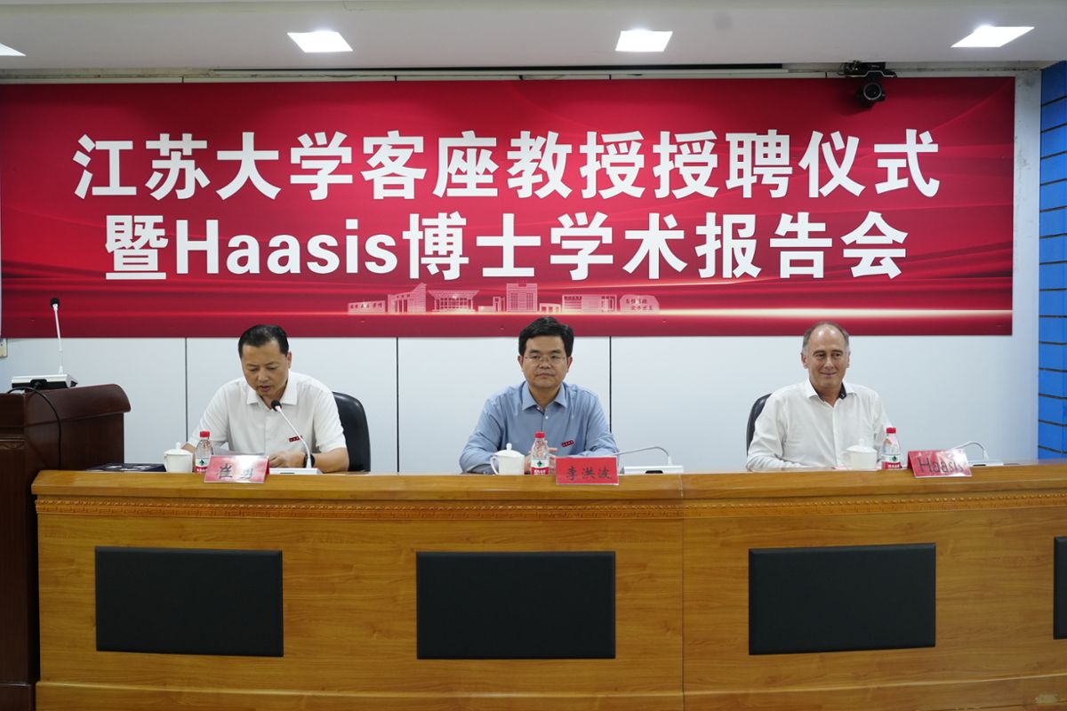 授聘儀式上,李洪波為哈西斯佩戴江蘇大學?;詹㈩C發客座教授聘書。