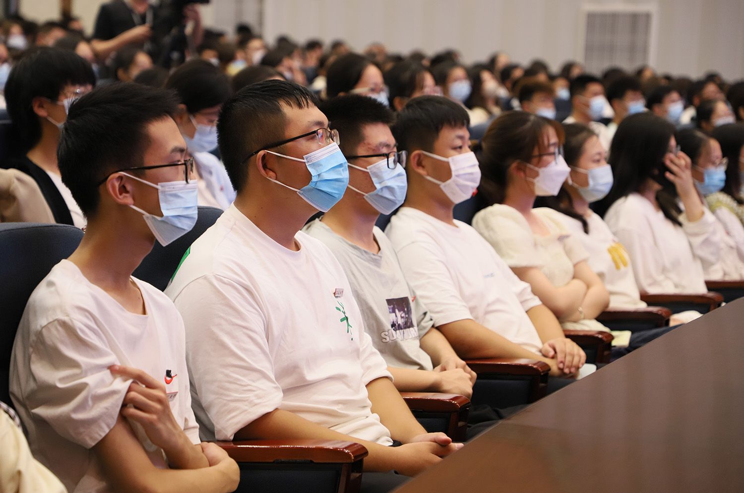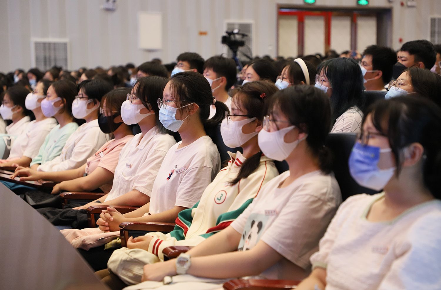 根據疫情防控需要,除部分學院新生在小禮堂線下聽課外,其余新生以不同方式線上收看授課直播。(黨委宣傳部)