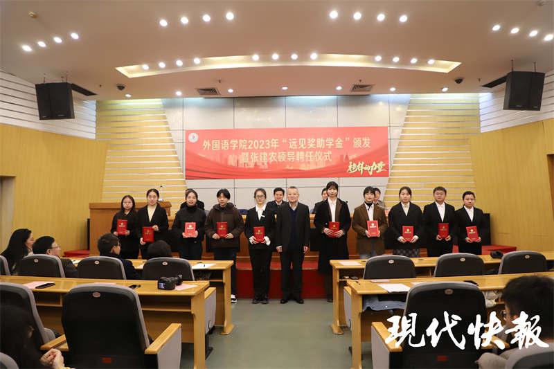 " 獎助學金取名‘遠見’,一是為紀念恩師張志遠先生,二是‘見’和‘建’諧音,希望同學們重視知識和能力建設,有遠見、要遠建,實現自己的理想。" 張建農說。張志遠是江蘇大學英語師資班的核心創始人之一,當年她克服缺教材、缺師資的巨大困難,從國內外、校內外爭取到眾多優質資源,讓身為學生的張建農收獲良多,學有所成。