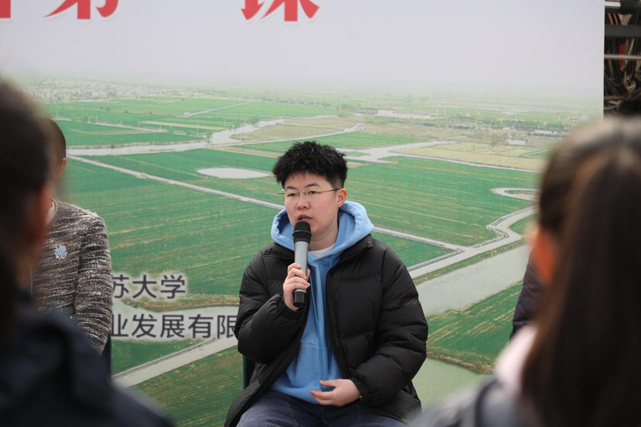江蘇大學農業機械化工程2022級碩士生、挑戰杯特等獎作品參與者李啟濱也受邀來到現場和“新禾”先鋒隊的大中小學生們互動交流。“我的研究方向是產量在線檢測技術,最終的落腳點是收獲機的智能化。我的導師徐立章告訴我們,要把論文寫在大地上,我們的科研成果不僅能夠真的有用,還要解決實際的農業生產問題。這就要求我們必須通過田間試驗采集到最準確的數據。”談及未來的發展,李啟濱表示,將盡自己最大的努力做出更多的科研成果,也希望在畢業后繼續跟隨導師攻讀博士學位,為我國的農機事業添磚加瓦。