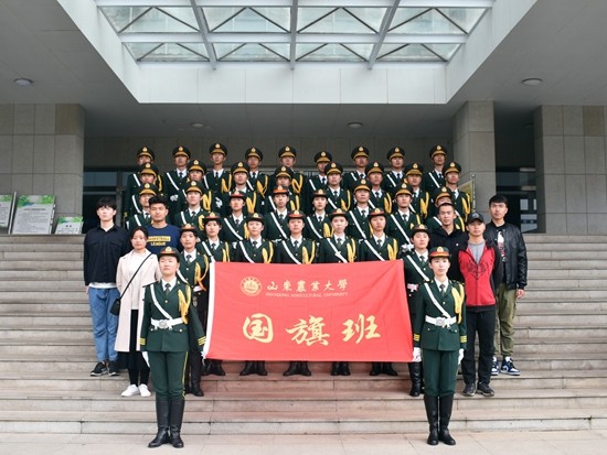 山東農業大學國旗班成立于1995年,是在校團委、學工處領導下的實行半軍事化管理的學生組織。國旗班秉持著“以我火紅青春,譜寫國旗禮贊,用我熱忱生命,捍衛國旗尊嚴”的宗旨,主要負責學校日常升降旗工作并開展愛國主義教育,曾多次參與高校升旗手大賽并榮獲山東青年五四先進集體稱號。國旗班憑借昂揚的精神、嚴明的紀律、認真的態度、自信的風貌成為校園中一道亮麗的風景線。